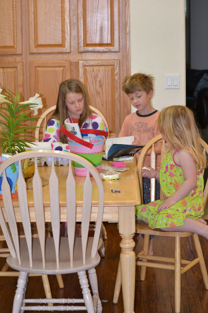 It rained on Easter Morning this year, so we had our annual Easter Egg hunt indoors in the front room. The kids didn't seem to mind at all. The kids each got a new book in their baskets. They had fun looking at them in the morning. We ate yummy eggs the kids had colored for breakfast.